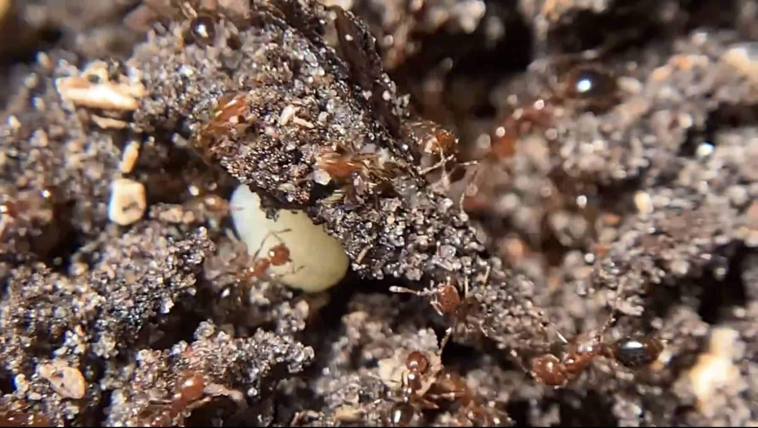 The queen ant lays tiny, oval-shaped eggs. These eggs are cared for by the workers and are often stored within the safety of the nest. The eggs are typically white and initially require a warm and humid environment to develop properly.